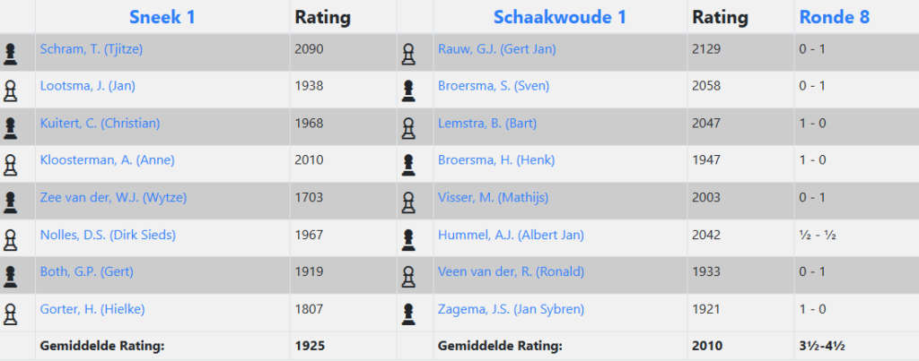 Met deze overwinning lijkt Schaakwoude redelijk zeker van handhaving, al staat het allemaal nog dicht bij elkaar. De volgende ronde wacht koploper Almelo.